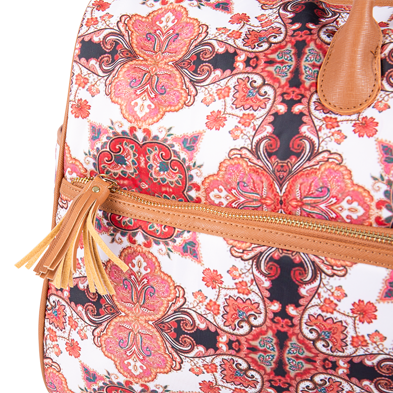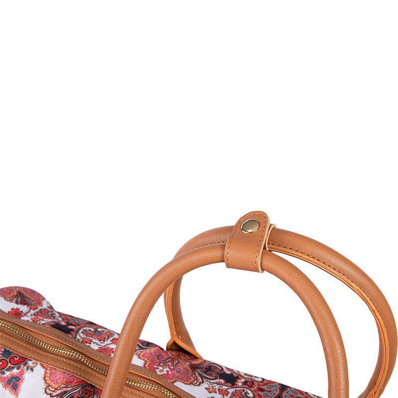Ova vrećica sadrži zamršene otiske koji miješaju vintage tropske uzorke s ikoničnim elementima jugoistočne Azije, poput cvjetova monograma. Prirodne obloge kravlje kože dodaju retro dodir stilu.